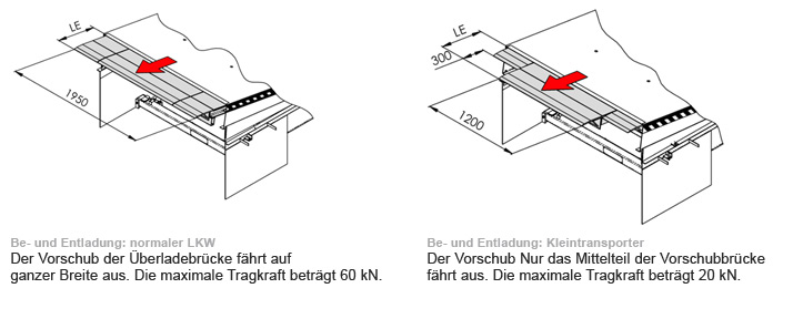 Je nach angedocktem Fahrzeug (Klein-Lkw / Transporter) stellt der Bediener über den Wahlschalter der Steuerung den entsprechenden Modus ein. Bei der Einstellung von Klein-Lkw / Transporter fährt lediglich das mittlere 1200 mm breite Vorschubsegment aus, die Tragkraft der Überladebrücke ist in dieser Betriebsstellung auf 20 KN reduziert. Durch die besondere Elt-Hydr.-Steuereinheit wird die Plateau-Auflagelast sowie die Auf- und Abwärts-bewegung der Ladefläche kontinuierlich nachgesteuert und dabei das Gewicht der Überladebrücke inkl. Ladelast nahezu kompensiert, letztendlich ist dadurch auch die Be- und Entladung von Kleintransportern realisierbar, eine Überlastung der Kleintransporter wird somit verhindert.