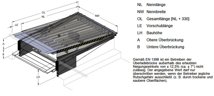 Erhebliche Baukostenersparnisse und die Unterfahrbarkeit mit Ladebordwänden sind die Vorteile dieser Bauweise. Alternative Rahmenformen sind je nach Einbausituation erhältlich. Die Tragfähigkeit entspricht der Achslast unter Berücksichtigung des ungünstigsten Belastungsfalles. Die Überladebrücke erfüllt die europäische Norm EN 1398.
