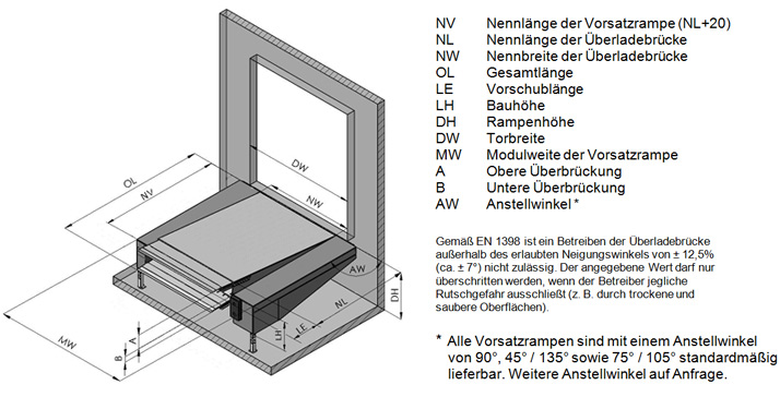 Die Vorsatzrampe A-VT ist ein autonomes, komplettes Verladesystem, das als selbsttragende Einheit vor die Toröffnung oder vor die Rampe installiert wird. Das Komplett-System ist besonders auch zur Installation an bestehenden Gebäuden ausgelegt. Für die Installation sind nur geringe, bauliche Maßnahmen als Voraussetzung erforderlich. Die Vorsatzrampen-Serie bietet unterschiedliche Anstellwinkel (45°, 75°, 90°, 105°, 135°) zur Gebäudefront an. So ist es möglich, vorhandene begrenzte Freiräume optimal zu nutzen und einen reibungslosen Verladevorgang zu gewährleisten.