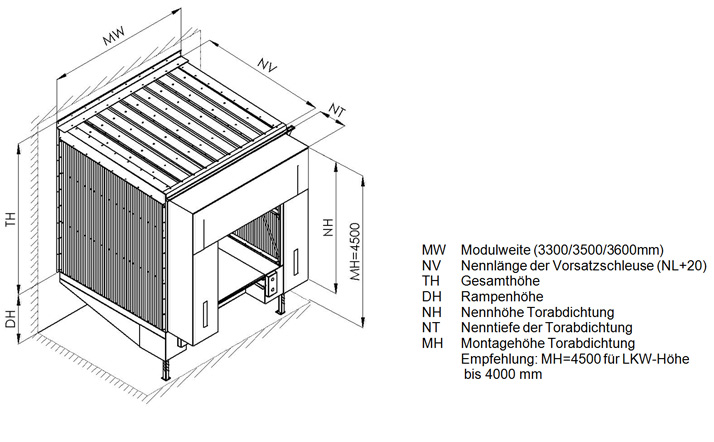 Die Vorsatzschleuse ist eine Einhausung, die zusammen mit der Vorsatzrampe eine in sich geschlossene Verladeeinheit zum Ansetzen an ein bestehendes Gebäude bildet und alle Komponenten einer Verladestation beinhaltet: